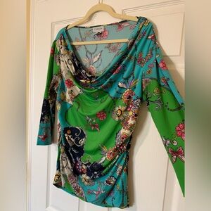 Carmen Marc Valvo Draped Neckline Green Floral Blouse Large Cottagecore Fairy
