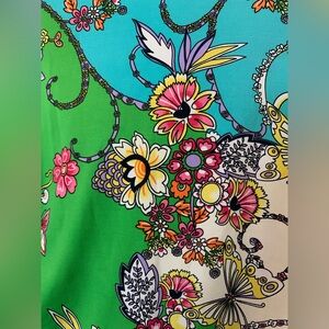 This elegant floral blouse by Carmen Marc Valvo has vibrant green and blue hues. It features a stylish draped neckline that with gathered side details for a fitted silhouette.