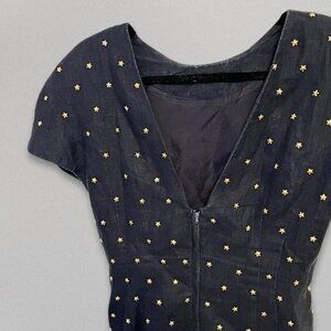 This striking Carmen Marc Valvo navy dress is adorned with shimmering metal star embellishments. Featuring a structured sheath silhouette with short sleeves and a dramatic V-back, this vintage piece offers timeless elegance with celestial flair.