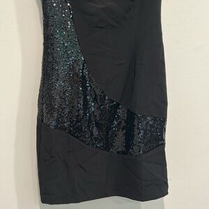 This elegant black dress features a stunning sequin design, perfect for any special occasion. The sleek and stylish look is sure to make a statement.