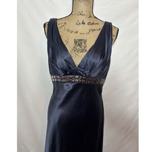 Carmen Marc Valvo evening gown / ball gown dress. Blue color with a satin shine material. Jewel / stone embellishments along waist. V neck. Side zip closure