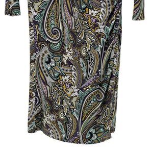 • V-Neck. Faux wrap front. 3/4 length sleeves. Knee length. Paisley print. Stretch material. Color: purple, white, gold, teal, gray. Fabric: 95% Polyester, 5% Spandex.