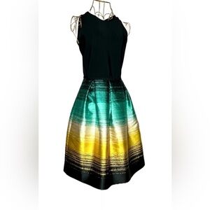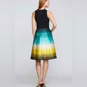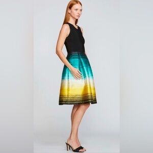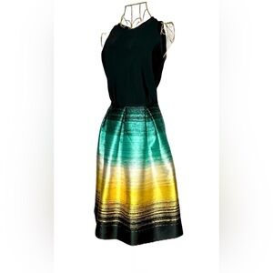 Rare Carmen Marc Valvo Sleeveless Fit & Flare Lined Black Dress with Back Zipper, Vibrant Multicolored Pleated Skirt, and Pockets, Size 2.