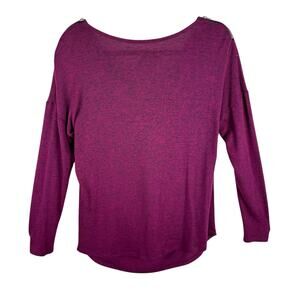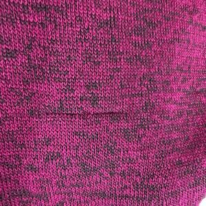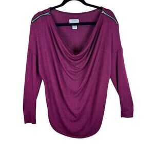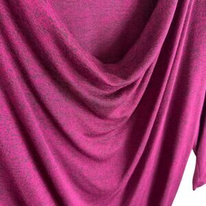 Excellent preowned condition, except for a small snag on lower front right. Fuschia & black speckled long sleeve drape neck tight knit lightweight pullover sweater. Zipper detail on shoulders. Rayon/polyester/spandex material. Approx. measurements: Shoulder to hem 32", pit to pit 24", sleeve from neck to sleeve hem 28". Size L.