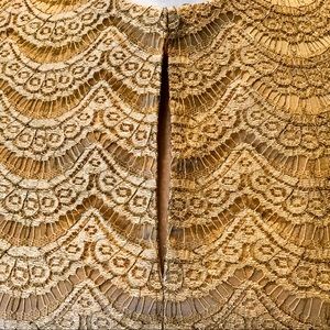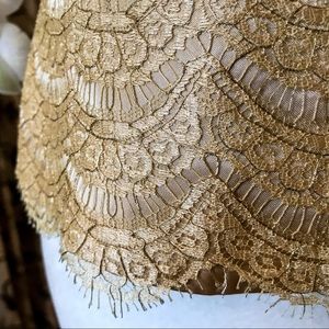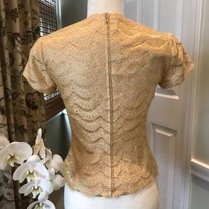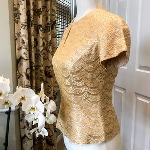This is a truly STUNNING top with a golden lace overlay and gold metallic thread running through it. I see it paired beautifully with a black velvet or satin skirt. In excellent, pre-owned condition. Size 4. Measurements: Waist 14”, Bust 16” across, hip 17 1/2”, Length 22”.