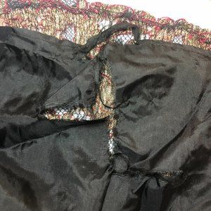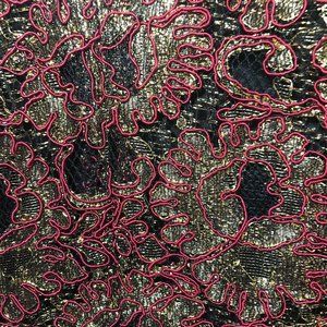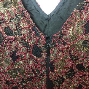 The gown features a gold metallic & black lace overlay w/red piping mimicking lace pattern with a black lining. The hidden center black zipper has a hook & eye closure.