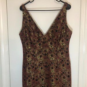 GORGEOUS Sleeveless V-neckline & V-back Carmen Marc Valvo Golden Leaf Gown w/Red Piping embroidery and a slight mermaid tail shape.