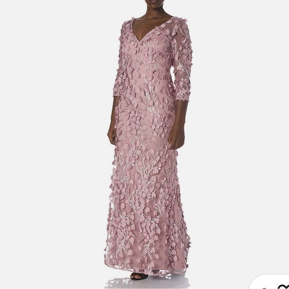 Carmen Marc Valvo Infusion 3D Floral Dusty Pink Evening Gown. Stunning pink evening gown with all over 3D flowers. Perfect for special occasions, mother of the bride, wedding guest, prom, bridesmaid. This dress features intricate detailing and a flattering silhouette. Three quarter length sleeves. Slight mermaid shape. V-neck. Pretty mauve, dusty rose, pink color. TTS to slightly generous sizing. Gently preowned with some discoloration at the hemline from contact with the floor. See photos for details and feel free to ask questions.