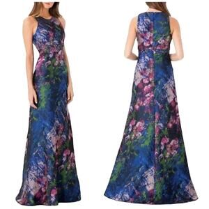 Carmen Marc Valvo Brocade Gown Intricately beaded blooms shimmer against the well-defined waist of this breathtaking Maxi length gown brightened in an abstract brocade of serene watercolors.