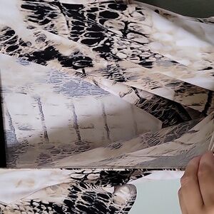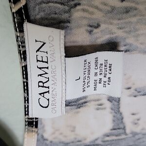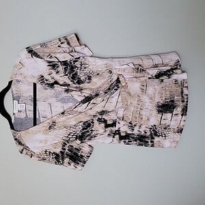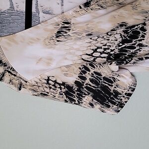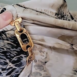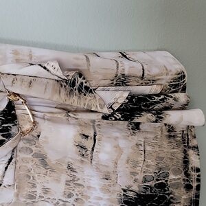 Tagged as a large, however measures more like a medium. White with creamish green color and black. There is a metal hardware accent at the waist, this item does have some scratches on it. Surplice at the chest. Stretch fabric. Great condition other than the scratches on the metal piece. There is also a little tiny ruffle below the metal piece. Please note, this item does have a perfume-y scent. I washed with scent free detergent, however the scent remained. Short sleeves. Office, workplace, dinner, date night, going out, 00's, abstract, wild, vibrant, church, brunch, event, dressy