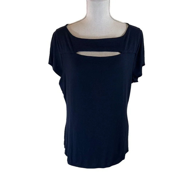 Carmen Marc Valvo Navy Blue Top XL Cutout Neckline Short Sleeve Stretch Knit
