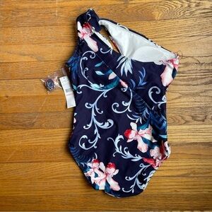 Elegant one-shoulder design. Navy base with vibrant floral print. Perfect for beach or pool.