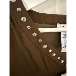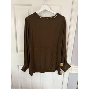Carmen Marc Valvo Olive Brown Studded V-Neck Blouse sz XL NWT