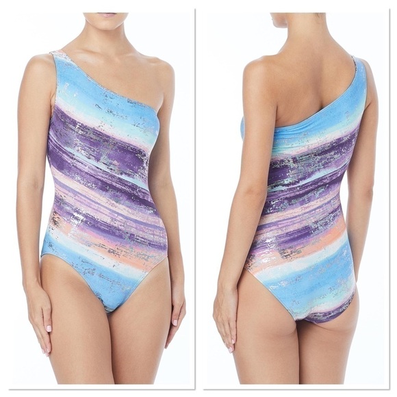 Taking inspiration from beautiful sunsets, the Carmen Marc Valvo One Shoulder One Piece Swimsuit with ombré hues and a slight sheen is more than beach ready. The asymmetrical neckline emboldens a classically sleek silhouette with a color palette that's as sexy as it is sophisticated.