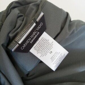Carmen Marc Valvo one-piece swimsuit in olive green microfiber.
