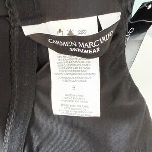 Carmen Marc Valvo one-shoulder swimsuit in black Style C66265A. Features a modern asymmetrical neckline with twist detail and full back coverage. Size 6. New with tags attached. MSRP $108.