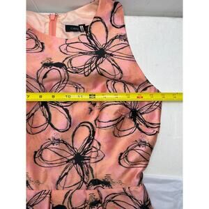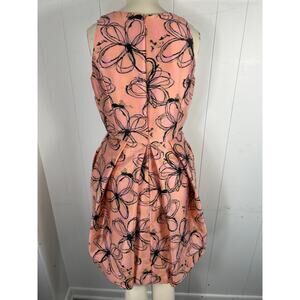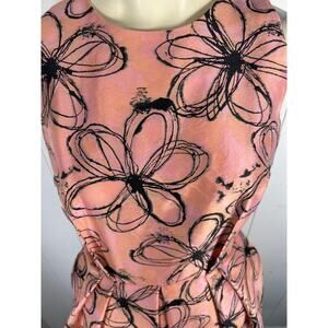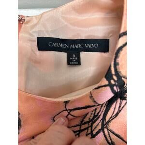 This is a beautiful Designer Carmen Marc Valvo cocktail dress in a size 8. The fit and flare dress features a lovely pale orange/pink with black floral pattern and a sleeveless design, perfect for any special occasion. It has a hint of the 50's in it's design.