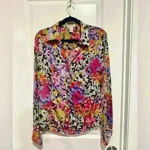 Beautiful Carmen Marc Valvo Retro Stained Glass Print Floral Silk Blouse Size L.