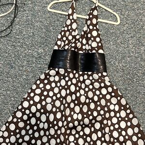 Carmen Marc Valvo halter dress in a brown, white, and black polka dot pattern.