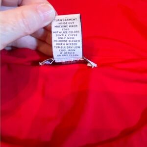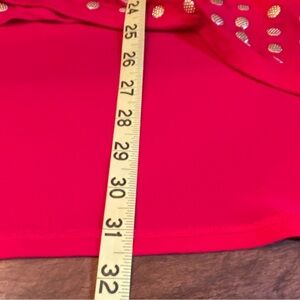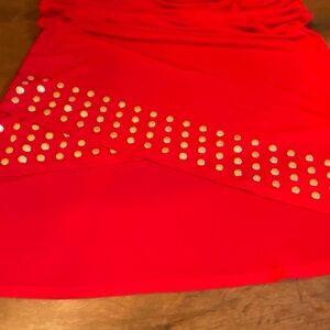 Very nice bouncy fabric, unusual layering & asymmetrical hem. Lots of gold colored studs, beautiful vibrant color