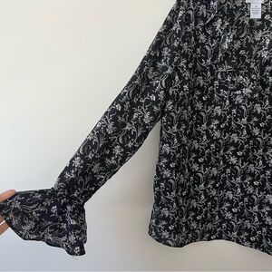 Carmen Marc Valvo long sleeve v-neck blouse. Black, white floral. Bell sleeves. Ruffles along neckline.