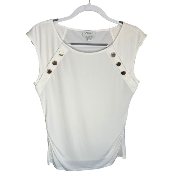 Keywords: Carmen Marc Valvo, white tank, cap sleeve, ruched, sleeveless, basic, casual, dressy casual, stretch, polyester, spandex, summery, versatile