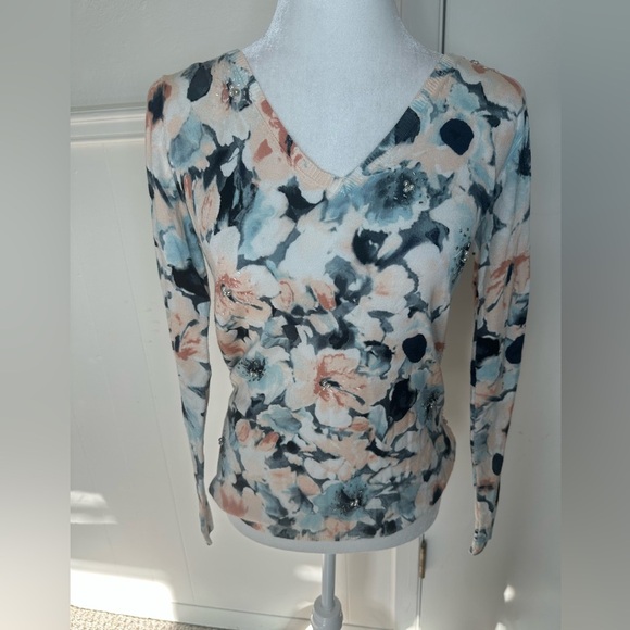 NWT. This elegant blouse by Carmen Marc Valvo features a fitted silhouette with long sleeves, crafted in a lightweight fabric. The top showcases a beautiful blend of white and blue hues, creating a sophisticated and versatile look. Perfect for adding a touch of elegance to any ensemble.