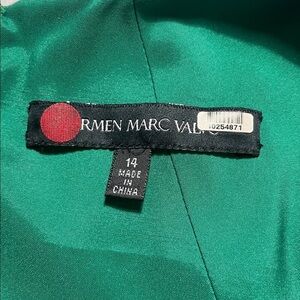 Elegant Carmen Marc Valvo sleeveless green evening gown. Features a fitted bodice with a flattering silhouette that flares slightly at the hem for a timeless, sophisticated look. Perfect for formal events, weddings, galas, or special occasions.