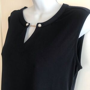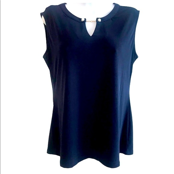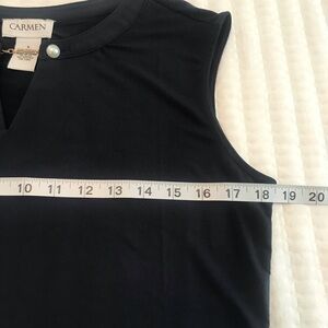 Beautiful Carmen Marc Valvo women’s navy top. Sleeveless, v-neck, pearl and chain embellishments, 95% polyester, 5% spandex, in excellent condition.