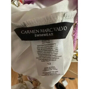 Keywords: Carmen Marc Valvo, one piece, pink swimsuit, women's swimwear, beachwear, poolside, square neckline, supportive straps, chain pattern, nylon, spandex, polyester, size 12, regular fit, new condition.