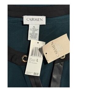 Keywords: Carmen Marc Valvo, Womens Top, Green Blouse, Long Sleeve Top, Faux Leather Trim, XL Blouse, Career Wear, Office Attire, Elegant Top, Contemporary Fashion, Designer Blouse, Casual Top, Crew Neck, Knit Top, Gold Hardware