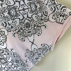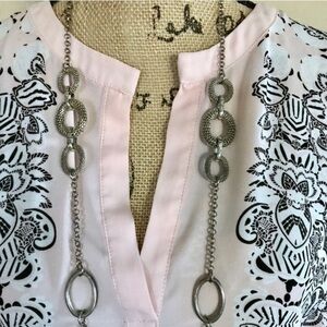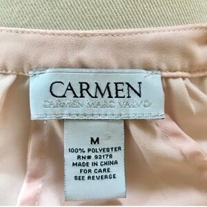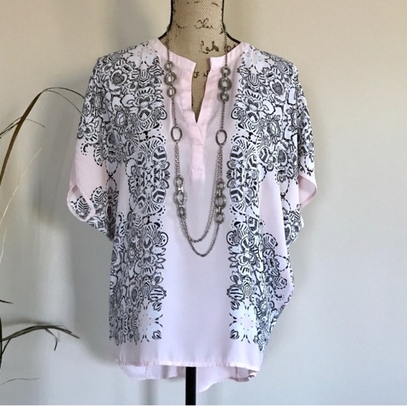 Chocolate brown and white print on pink chiffon blouse from Carmen Marc Valvo. Round neckline with v cut, popover styling, elbow length dolman sleeves, high low curved hem. Size M. Excellent condition. 100% polyester. Machine wash. ⭐️. C18