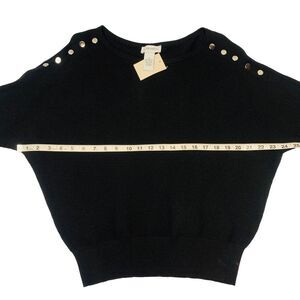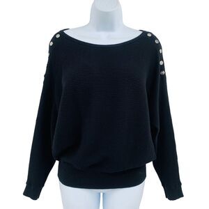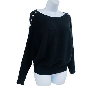 This is a Carmen Marco Valvo ribbed knit sweater. It has decorative silver buttons on each shoulder which leads to a slimming dolman sleeve. Great for a special night out or everyday wear.