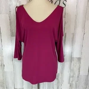 Carmen Marc Valvo Raspberry Purple V Neck Cold Shoulder Hardware Shirt Top Blouse