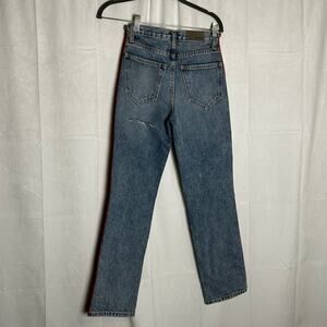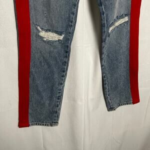 Carmen Straight Thrashed Distressed High Rise Red Tuxedo Stripe Denim Blue Jeans