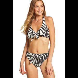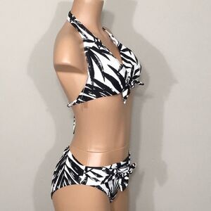 Stylish and sophisticated, the Carmen Marc Valvo Halter Bikini Top is perfect for poolside lounging. Removable soft cups add lift while the halter neck tie and back hook customize your fit. The bottoms are high cut leg an high waisted with a tie belt in the front. Ruched partway down the back for a sexy look. I love these! I would be willing to switch the sizes around. I also have a large bottom that I can swap out.