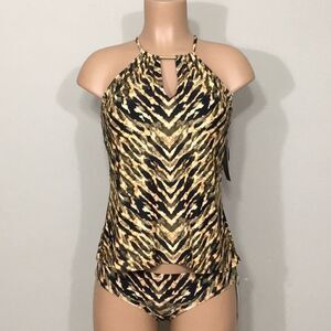 The high-neck silhouette of Carmen Marc Valvo's tankini top lets the style of the hardware-detailed cutout really shine.