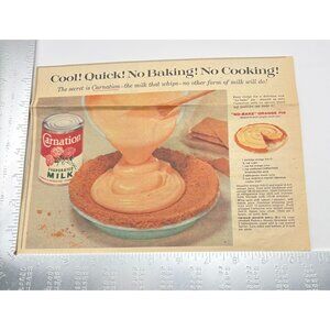 An enchanting relic from culinary history, this vintage 1956 magazine ad from the Family Weekly Magazine unveils an effortless "No-Bake Orange Pie" recipe. Showcasing classic advertising design, it features Carnation Evaporated Milk as the secret ingredient, promising a smooth, creamy pie. A charming blend of nostalgia and practicality!