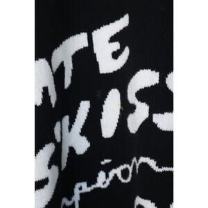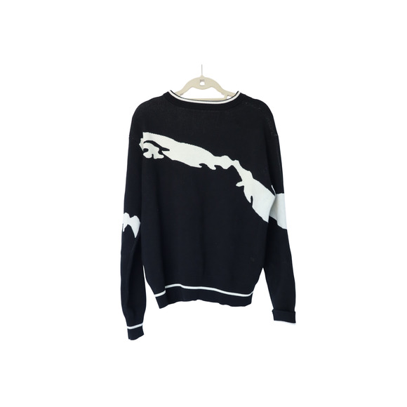 This black sweatshirt blends wool and recycled nylon for warmth and sustainability. It features jacquard text and graphics throughout, with striped rib knit details at the crewneck, hem, and cuffs for a stylish finish.