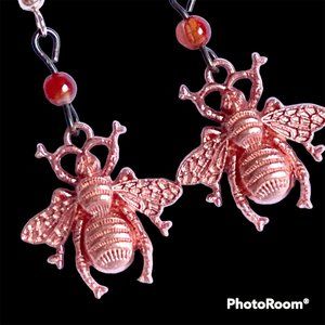 Carnelian Bead Bumble Bee Earrings Rose Gold Plated Dangle Queen Bea Orange