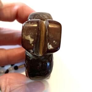 This heavy pendant is hand carved from deep brown carnelian chalcedony in the form of a stylized Taotie mask, a motif rooted in early Chinese art. The piece shows fine detailing and displays strong light translucence when backlit. Cool to the touch and highly polished, it reflects the 20th-century revival of archaic Chinese symbolism. It appears to have been part of a larger piece at some point, and I am selling it as I received it, as shown in photos.