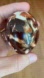 Deep amber colored carnelian palm stone with orca agate. Blue banding and small druzy pocket on one side. Gorgeous unique piece.