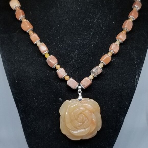 I made this beautiful necklace with 4mm Carnelian beads, silver filigree bead caps, 5mm square Red Onyx beads, and a 40mm hand carved Carnelian rose focal. It has a lobster clasp closer and measures 23” without the focal.