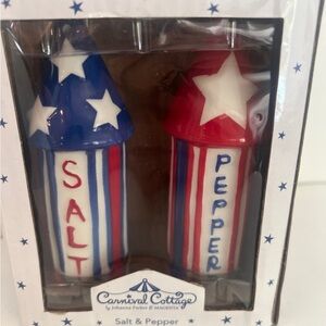 NWT Johanna Parker Carnival Cottage 4th of July Patriotic Salt & Pepper Fireworks Shakers. Such a cute addition to your JP and Rae Dunn Tier Tray designs and displays!