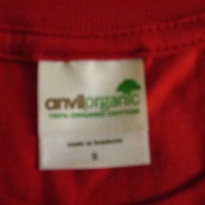 Garment Label: "Anvil Organic. 100% Organic Cotton. Pre Shrunk. Made in Honduras. S."