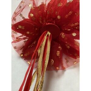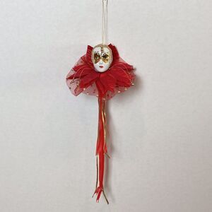 As you can see by the photos, the porcelain face is wearing a gold butterfly eye mask, a gold headpiece with gold beads that drape on her forehead, she is wearing a red voluminous collar which seems to be a poinsettia flower and underneath it a tulle ruffle. There are red & gold ribbons streaming from the bottom of the head piece part.
