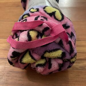 New with tags, multicolor, pink, blue, purple, yellow, heart patterned, 100% polyester, fleece, pull-on, sleep, lounge pants by Carnival Intimates in a women's size medium. Elastic waist with drawcord. Machine washable. In excellent, unused condition.