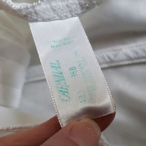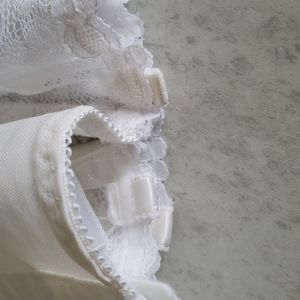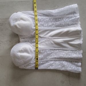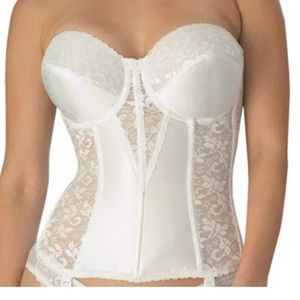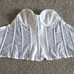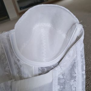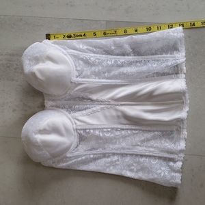 Size 36 B; Beautiful bustier, worn one time under a wedding dress. Has 4 hooks across the bottom for attaching to thigh high stockings. Excellent condition, refer to pics.