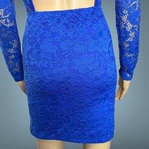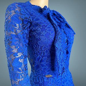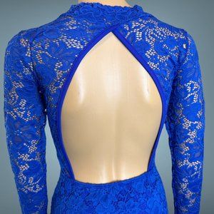 Carol Catugy Full Lace Bodycon Dress Medium Blue Backless Bow High Neck Stretch