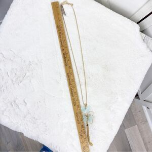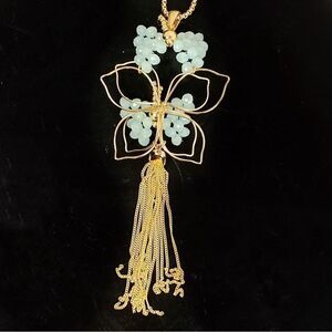 Gold tone metal, Pale blue beads, 3D bent wire butterfly, Beaded butterfly, Chain tassel, Extra long length, Adjustable length, Lobster claw clasp